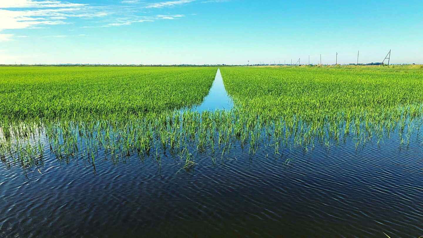 Siamo nella splendida cornice del Parco del Delta del Po, in provincia di Ferrara, le risaie si estendono a perdita d’occhio, le piante mosse dal vento occhieggiano tra i riflessi dello specchio d’acqua, creando uno scenario unico e suggestivo. Non è un caso che questo territorio sia stato riconosciuto come patrimonio dell’UNESCO. Qui il riso penetra con le sue radici nella terra umida, estrae la linfa e diventa chicco.